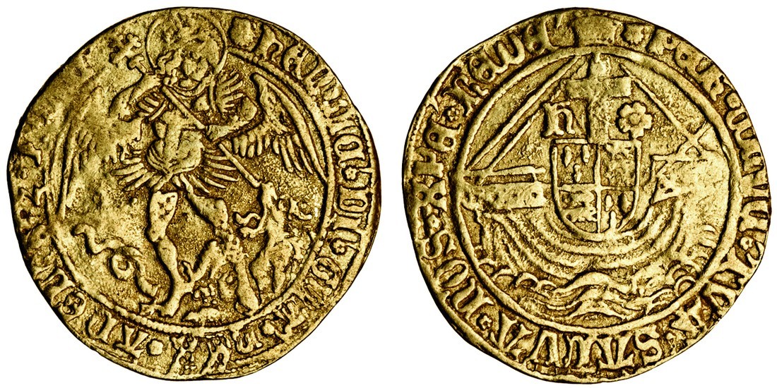 Henry VII (1485-1509), Angel, 4.94g, m.m. escallop, St Michael spearing dragon, rev. shield within ship, dividing h and rose (N.1696; S.2183), creased, rusty dies, good fine