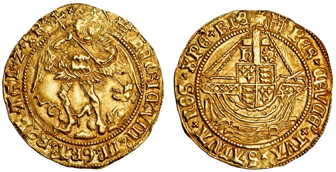 Henry VIII (1509-47), first coinage 1509-26, Angel, 5.12g, m.m. portcullis, St Michael spearing dragon, rev. shield within ship, cross dividing h and rose above (N.1760; S.2265), mark on edge at 12 o'clock and tiny scrape on reverse, otherwise good very fine