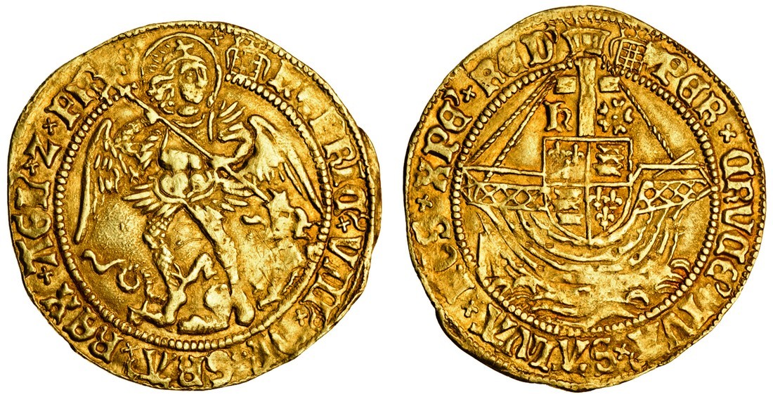 Henry VIII (1509-47), first coinage, 1509-26, Angel, 5.05g, St. Michael spearing dragon, henric viii etc, legend ends fr, rev. shield within ship, cross dividing h and rose, saltires stops, legend ends red', m.m. crowned portcullis with chains (N.1760; S.2265), graffitti on obverse, a few weak areas, very fine