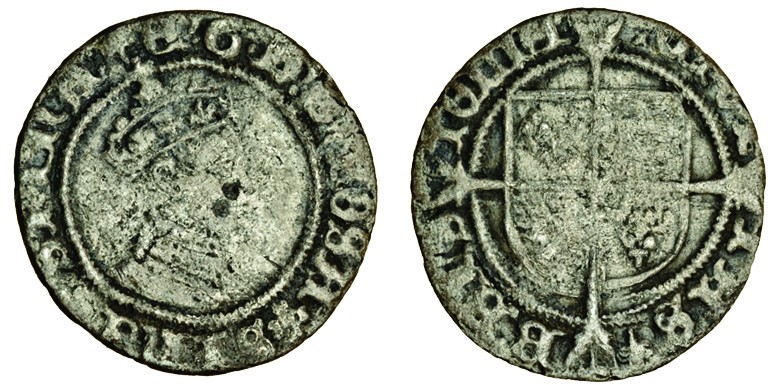 Edward VI (1547-53), first period, 1547-49, Penny, 0.56g, Bristol, no mm., legend begins E 6 D G, crowned bust right, rev. shield over long cross fourchée (N.1903; S.2462), black stains on bust, fine for issue, rare