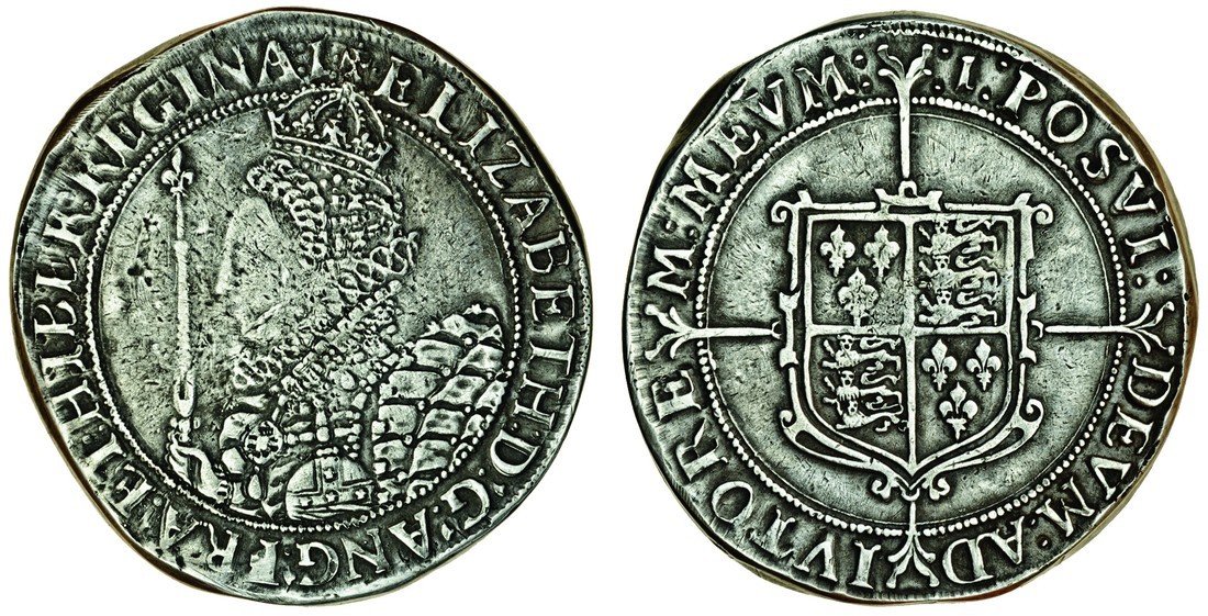 Elizabeth I (1558-1603), seventh issue, 1601-2, Crown, 29.78g, m.m. 1, crowned bust, with ornate dress and holding sceptre and orb, left, rev. garnished shield over long cross fourchée (N.2012; S.2582), edge smoothed, scuffed, weak on face, very fine