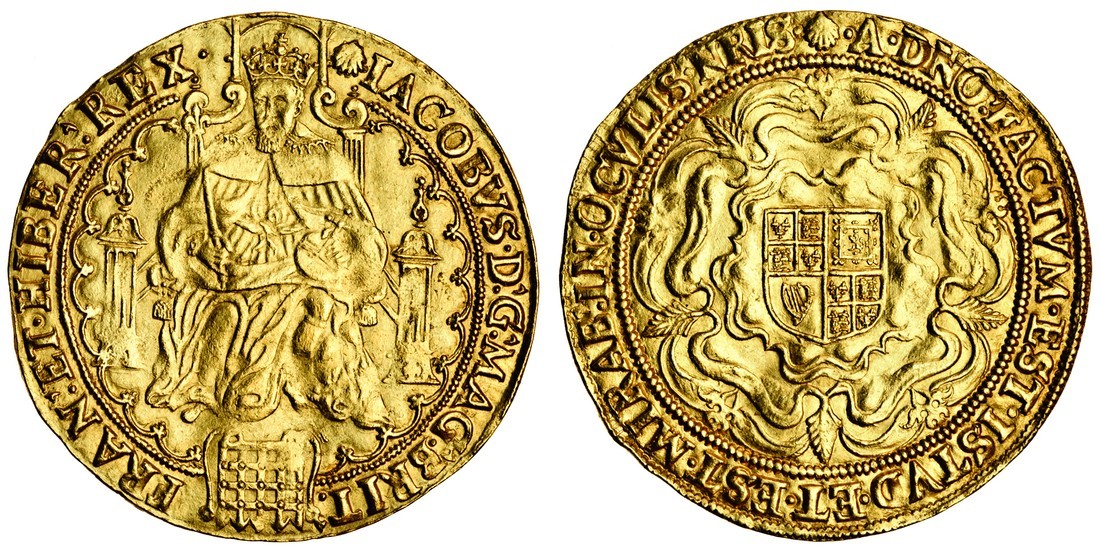 (x) James I (1603-25), second coinage, 1604-19, Rose Ryal, 13.83g, m.m. escallop, king, crowned seated on elaborate throne, portcullis below, rev. shield on double rose (N.2079; S.2613), faint crease mark from 11 o'clock to 5 o clock, a little weakness but generally well struck and with a good proportion of detail visible on the low-relief figure of the king, good very fine and with much lustre