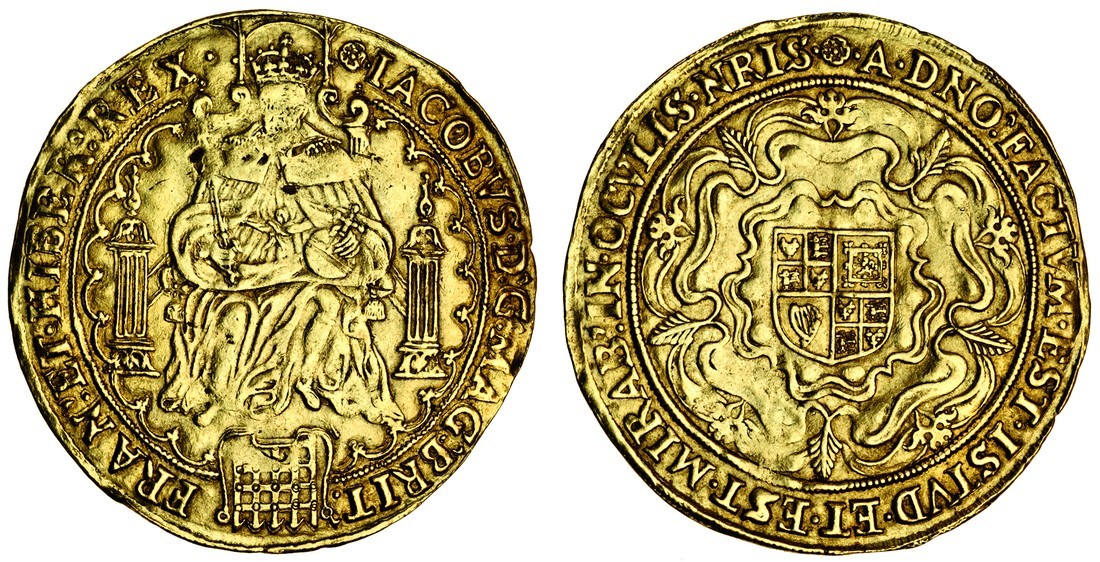 James I (1603-25), second coinage, 1604-19, Rose Ryal, 13.65g, m.m. rose, king, crowned seated on elaborate throne, portcullis below, rev. shield on double rose (Schneider 6 - same dies; N.2079; S.2613), knock in obverse field beside sceptre, weakness on sovereign otherwise nearly very fine