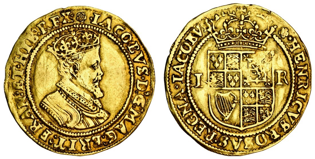 James I (1603-25), second coinage 1604-19, Double-Crown, 4.93g, m.m. rose, fourth crowned bust right, rev. crowned shield dividing i r (Schneider 32; N.2087; S.2622), light crease, scratches behind bust, nearly very fine