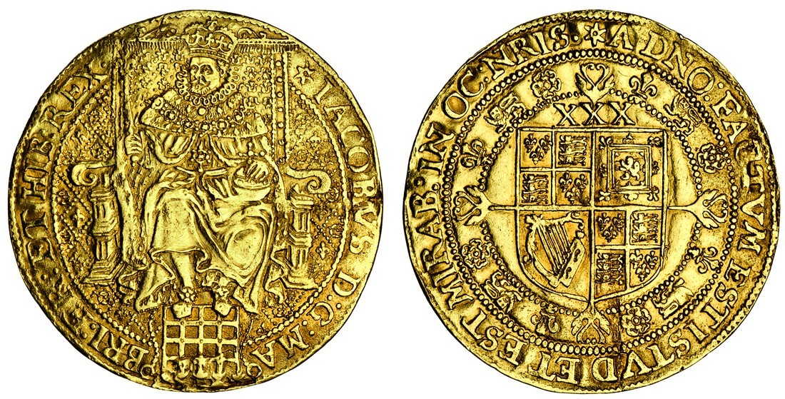 James I (1603-25), third coinage, 1619-25, Rose Ryal, 12.25g, m.m. spur rowel, James, crowned and robed, seated on throne with ornamented back, holding orb and sceptre, portcullis below, rev. shield over cross fleury, xxx above, band with lis, leopards and roses around (Schneider II, 77 - same dies; N.2108; S.2632), light crease mark from 3 o'clock to 9 o'clock, struck from rusty dies giving a matte appearance in areas, full, centred and lustrous, extremely fine