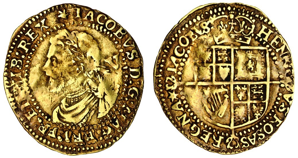 James I (1603-25), third coinage, 1619-25, Quarter-Laurel, 2.17g, m.m. spur rowel, laureate, draped bust left, rev. crowned shield over long cross fourchée (Schneider 93; N.2118; S.2642), creased, double struck on obverse, good fine