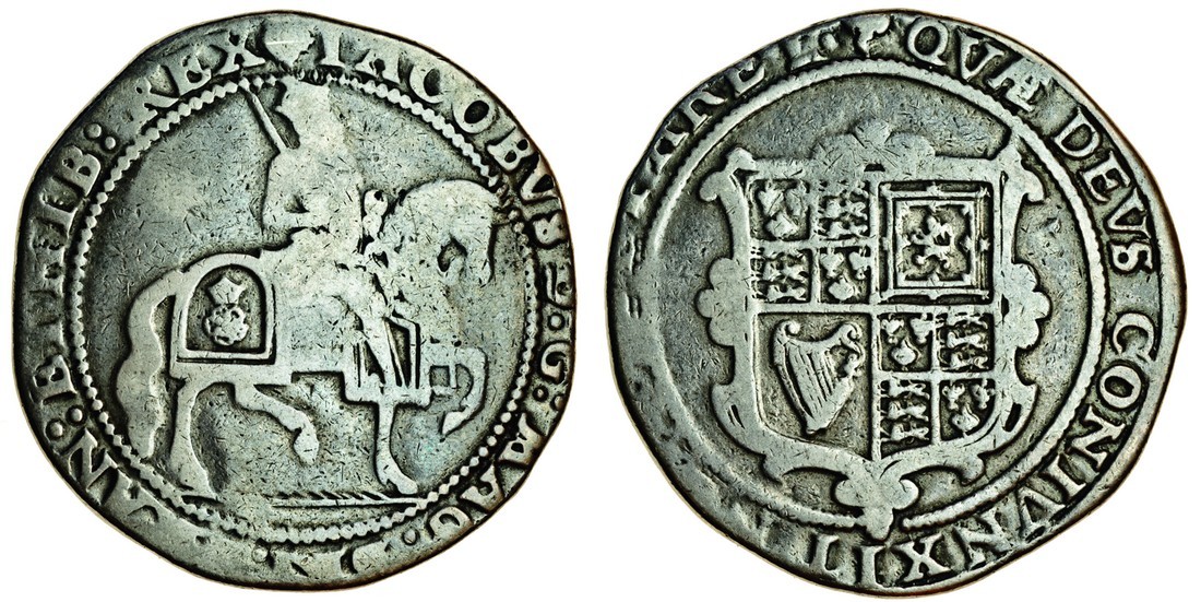 James I (1603-25), third coinage, 1619-25, Crown, 28.80g, m.m. trefoil, king, crowned, riding right on caparisoned horse, grass line below, rev. garnished square topped shield (N.2120; S.2664), fair