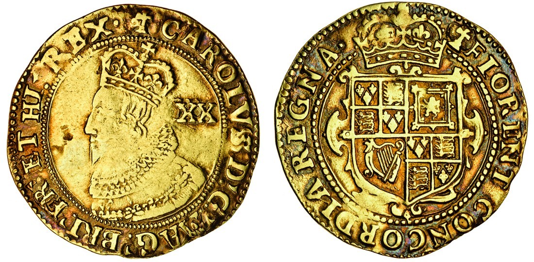 Charles I (1625-49), Unite, 8.78g, group A, m.m. cross calvary over lis, first bust in coronation robes, flatter single-arched crown, rev. crowned garnished shield (Schneider 118-19; N.2147; S.2686), toned, digs before bust, weakness, about very fine