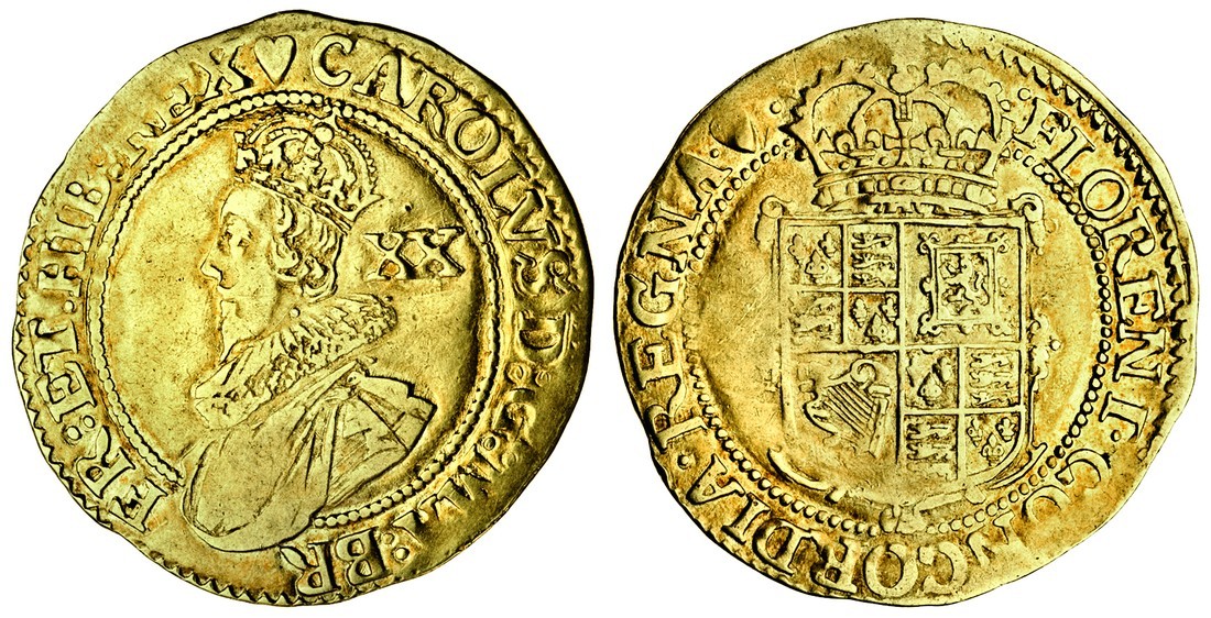 Charles I (1625-49), Unite, 8.88g, group B, elongated bust, rev. crowned square-topped garnished shield, m.m. heart (Schneider 127-128; N.2149; S.2688), light scratch beside reverse shield, weakness to bust, some facial detail remains, nearly very fine