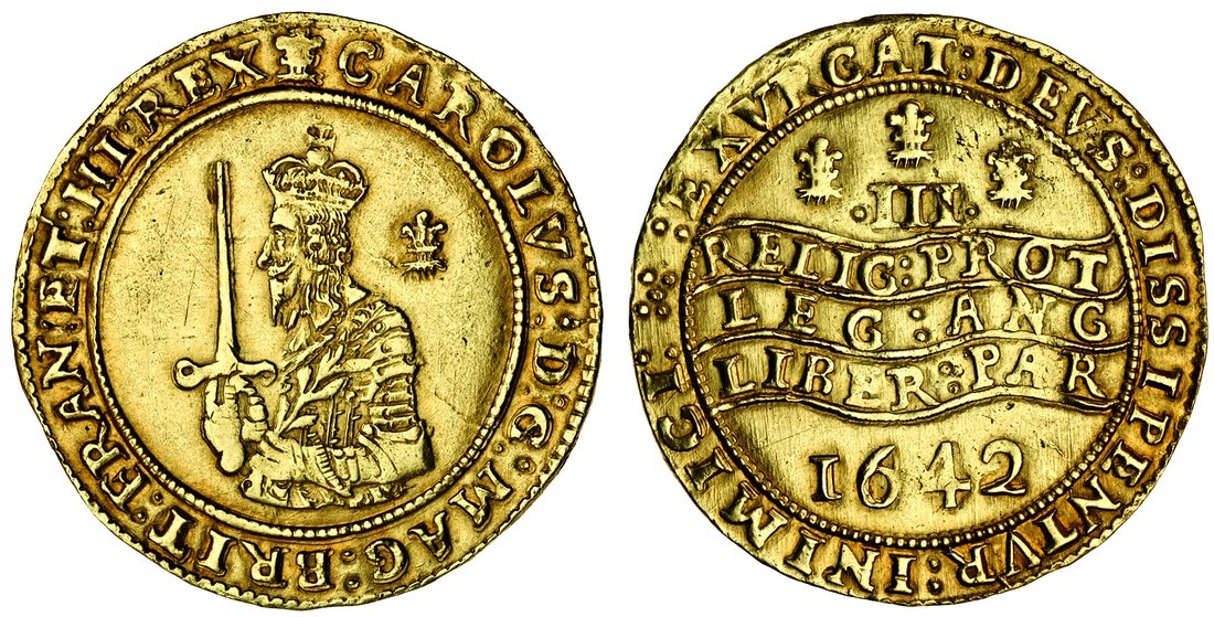Charles I (1629-45), Civil War coinages, Oxford, 1642-46, Triple Unite, 26.92g, 1642, m.m. plume/5 pellets, king half length left, crowned, armoured, holding sword and laurel branch, Oxford plume behind, rev. Declaration in three lines, three Oxford plumes above, date below (Beresford-Jones dies III/S2; Schneider 286 -same dies; Brooker 832 - same dies; N.2381; S.2724), several die flaws evident as well as old handling marks, the bust mostly struck up, very fine or better