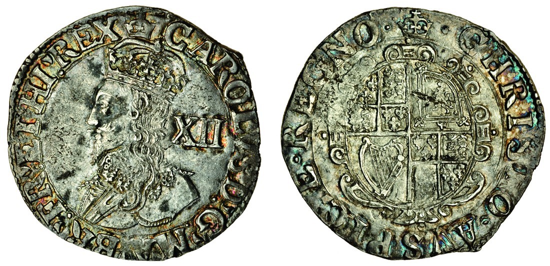 Charles I (1625-49), Shilling, 6.03g, group D, type 3a, m.m. crown, crowned bust left, rev. garnished oval shield, (N.2225; S.2791), irridescent toning in legends, full legends and a remarkably well struck bust for this with much of the fine detail in good order, very pleasing, good very fine, the portrait probably better