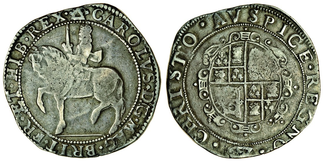 Charles I (1625-49), Briot’s hammered issue, 1638-39, Halfcrown, 15.20g, m.m. triangle over anchor/triangle over anchor, mule with Tower reverse, Briot style horse with ground line, rev. group III, oval garnished shield, (Brooker 734; N.2307/2209; S.2861/2773), uneven flan and weakness to equestrian portrait as is usually seen on this issue, even tone and comparatively full, very fine for this, very rare