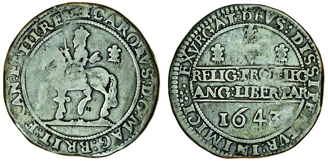 Charles I (1625-49), Civil War coinages, Oxford,, 1642-46, Crown, 33.60g, 1643, m.m. plume/-, king, crowned, riding left, groundline below, Oxford plume behind, rev. Declaration in two lines, three Oxford plumes above, date below (N.2406; S 2947), toned, digs next to horse's hoof, about fine