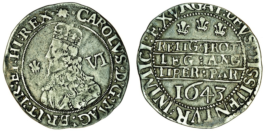Charles I (1625-49), Civil War coinages, Oxford, Sixpence, 2.99g, 1643, Aberystwyth die, rev. three Shrewsbury plumes above Declaration, m.m. book / - (Morrieson A-4, N.2549; S.2981), wear on portrait, clear declaration, very fine