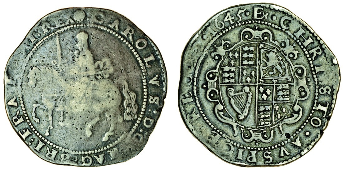 Charles I (1625-49), Civil War coinages, Exeter, 1643-46, Crown, 27.27g, 1645, m.m. rose/Ex, king crowned, riding left, sash in bow, rev. garnished oval shield (N.2558; S.3059), pitted surface on obverse, fine, reverse better
