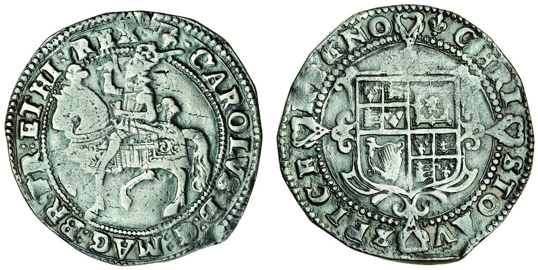 Charles I (1625-49), Tower under the King, Halfcrown, 14.74g, group 1, type 1a2 , m.m. lis, King on horseback left, no rose on housings, no ground line, rev. square-topped shield over long cross fourchée (Brooker 278-79; N.2201; S.2764), cleaned, good fine