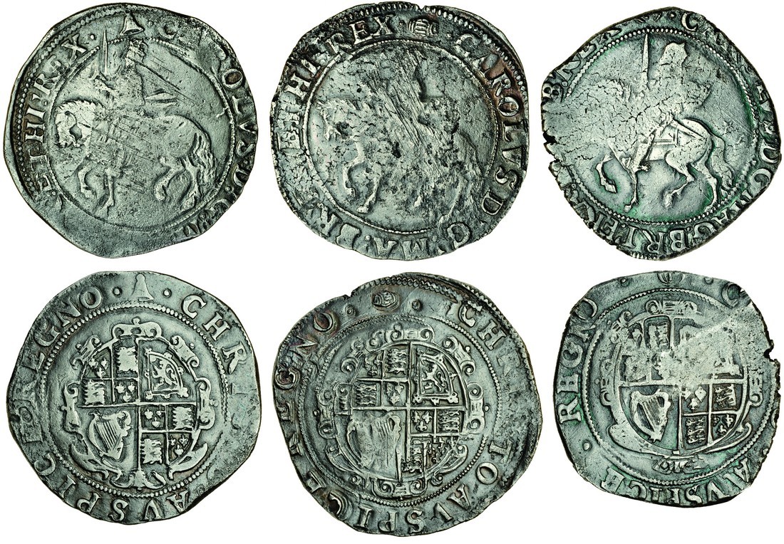 Charles I (1625-49), Tower under the King, Halfcrowns (2), 14.71g, group III, type 3a1, m.m. bell (Brooker 321; N.2209; S.2773), previously cleaned, weakness in parts, scraped on obverse fine, 14.79g, group, type 3a1, m.m. tun (Brooker 334-35; N.2209; S.2773) scraped on portrait, fine, Tower under Parliament, Halfcrown, 15.22g, group III, type 3a3, m.m. P in brackets, (Brooker 355; N.2213; S.2778) previously cleaned, weakly struck, good fine (3)