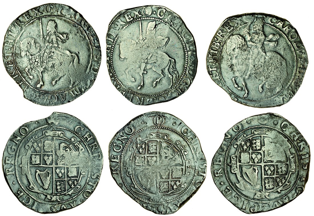 Charles I (1625-49), Tower under the King, Halfcrown, 14.67g, group IV, type 4, m.m. triangle-in-circle (Brooker 371-76; N.2214; S.2779), previously cleaned, weakness in parts, damages to edge, good fine, Tower under Parliament, Halfcrowns (2), 14.85g, group III, type 3a3, m.m. P in brackets, (Brooker 356; N.2213; S.2778), previously cleaned, weakness in parts, good fine, 15.36g, similar, fine (3)