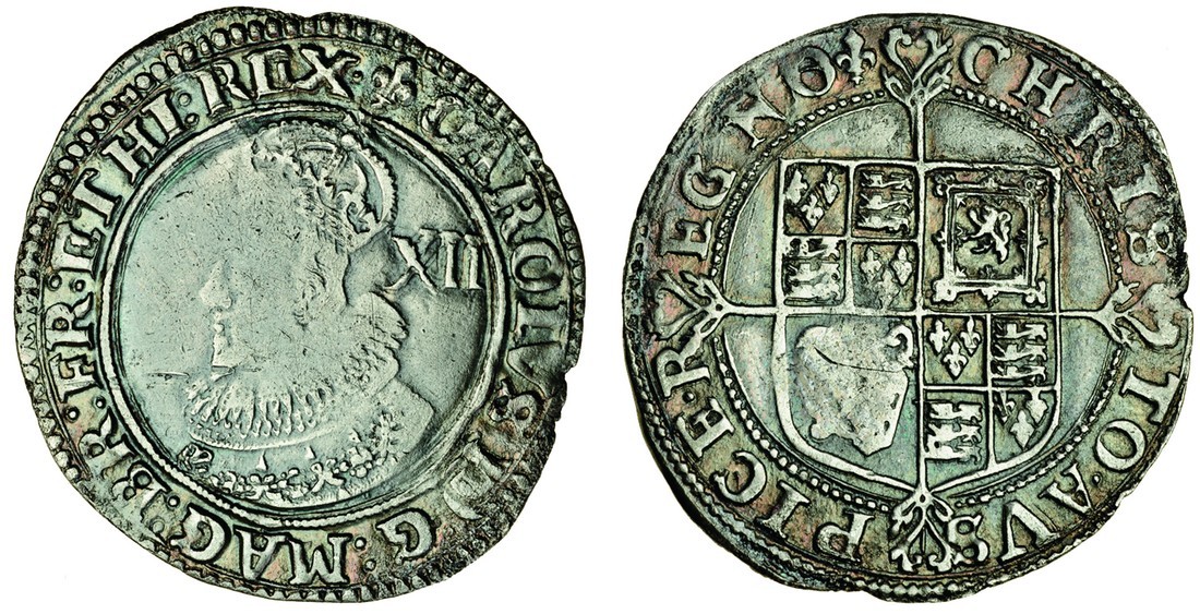 Charles I (1625-49), Shilling, 5.64g, group A, bust 2, m.m. lis, crowned bust left, in coronation robes, larger crown, outer arch only jewelled, rev. square-topped shield over long cross fourchée (Brooker 386-89; N.2216; S.2782), previously cleaned, toned, weakness on face and shield, corrodded on legend from 4 to 6 o'clock, tiny scratch on obverse, good fine