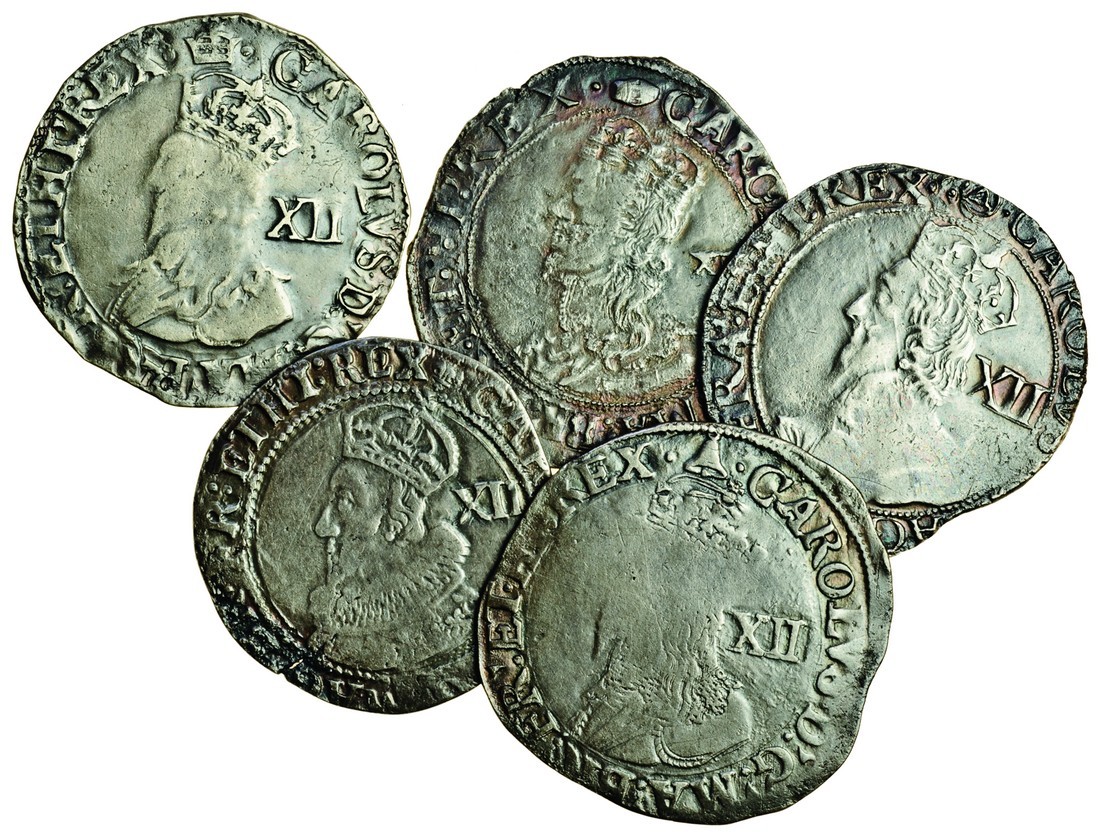 Charles I (1625-49), Tower mint under the King, Shillings (5), m.m. lis, bell, crown, tun, triangle-in-circle, previously cleaned, generally fine to good fine (5)