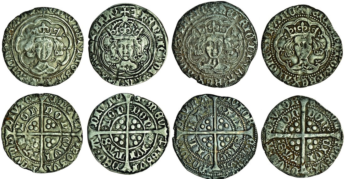 Groats (4), Henry V, 3.42g, Class C, frowning bust, London (N.1387b; S.1765), face weak, nearly very fine, Henry VI, first reign, 3.56g, annulet issue, 1422-30, Calais, angl' (N.1424; S.1836), dark tone, nearly very fine, Edward IV, first reign, 2.79g, London, m.m. long cross fitchée/sun (N.1577; S.2003), nearly very fine; Henry VII, 2.72g, class IIIc, m.m. inverted anchor (N.1705c; S.2199), face weak, good fine or better (4)
