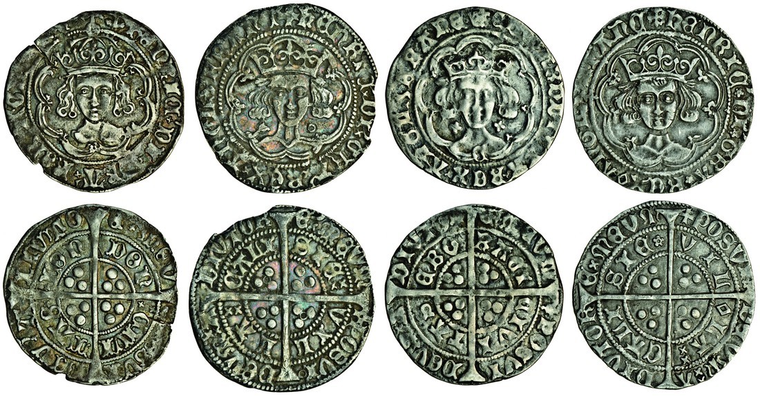 Groats (4), Henry VI, first reign (2) 3.52g, annulet issue, 1422-30, Calais, angl' (N.1424; S.1836), some flan loss, nearly very fine, 3.76g, rosette-mascle, 1430-31, Calais, angl' (N.1446; S.1859), pleasing bust, very fine, Edward IV, first reign, 2.95g, York, m.m. crown/lis over crown (N.1583; S.2012), full flan, good fine or better; Henry VII, 2.77g, class IIIc, m.m. anchor (N.1705c; S.2199), flan split, nearly very fine (4)