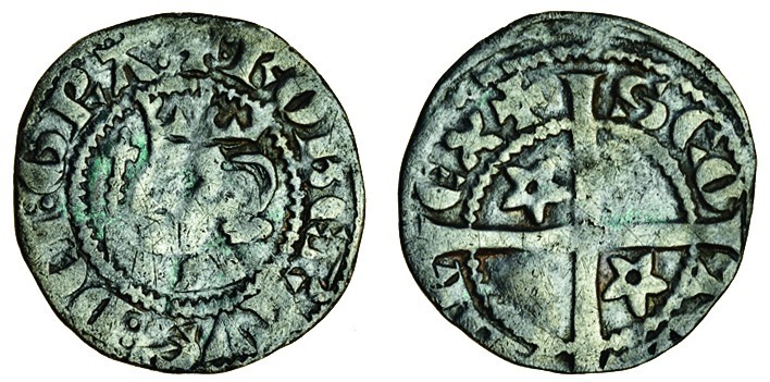 Scotland, Robert I 'the Bruce' (1306-29), Halfpenny, 0.60g, crowned bust left, +.robertvs: dei: gra:, rev. rex scotorvm, long cross, mullet in two angles (S.5077), a field find, off-struck on reverse, toned, some detail to bust, nearly very fine, very rare