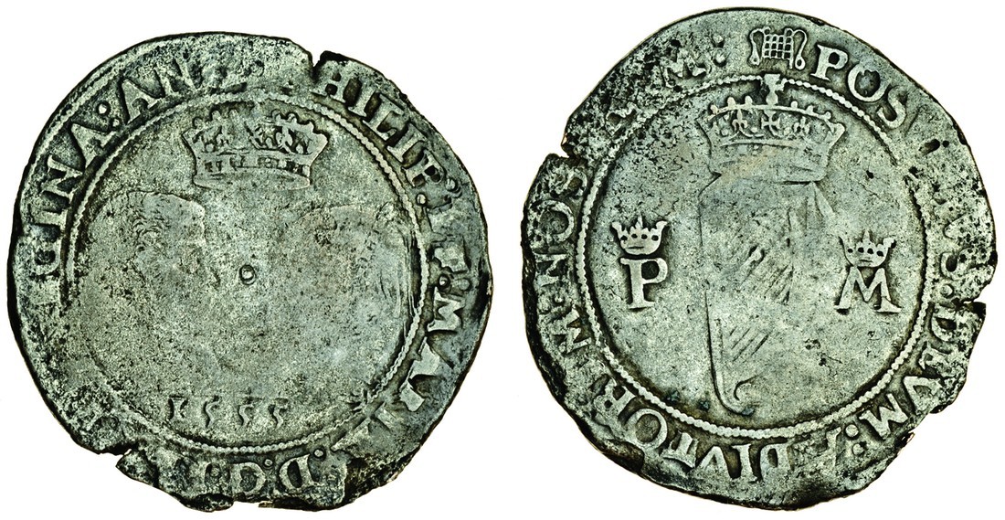 Ireland, Philip and Mary (1554-58), Shilling, 7.96g, 1555, m.m. portcullis on reverse only, busts vis-à-vis, crown above, date below, rev. crowned harp, crowned p to left and crowned m to right (S.6500), edge damages, about fine