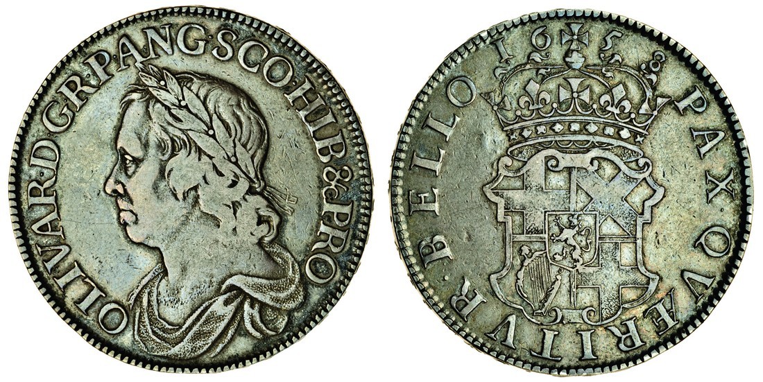 Cromwell, Crown, 1658/7, laureate, draped bust left, rev. crowned arms of the Protectorate, edge inscribed (ESC 10; S.3226), toned, marks in fields, about very fine