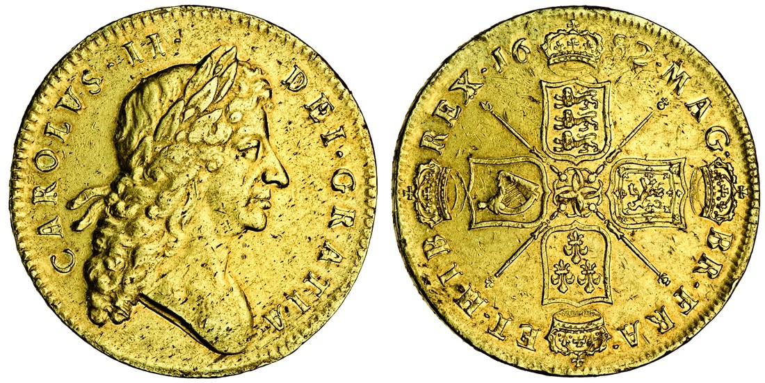 (x) Charles II (1660-85), Five-Guineas, 1682, tricesimo qvarto, second laureate bust, rev. four crowned shields cruciform, sceptres in angles (Schneider -; MCE 25; S.3331), some brilliance, marks on edge, haymarking, good very fine