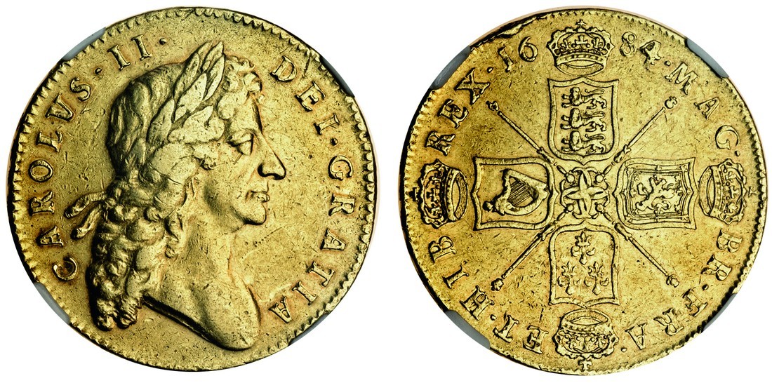 Charles II (1660-85), Five-Guineas, 1684 TRICESIMO SEXTO, second laureate head right, rev. four crowned shields cruciform, sceptres in angles (MCE 29; S.3331), in NGC holder, graded xf40