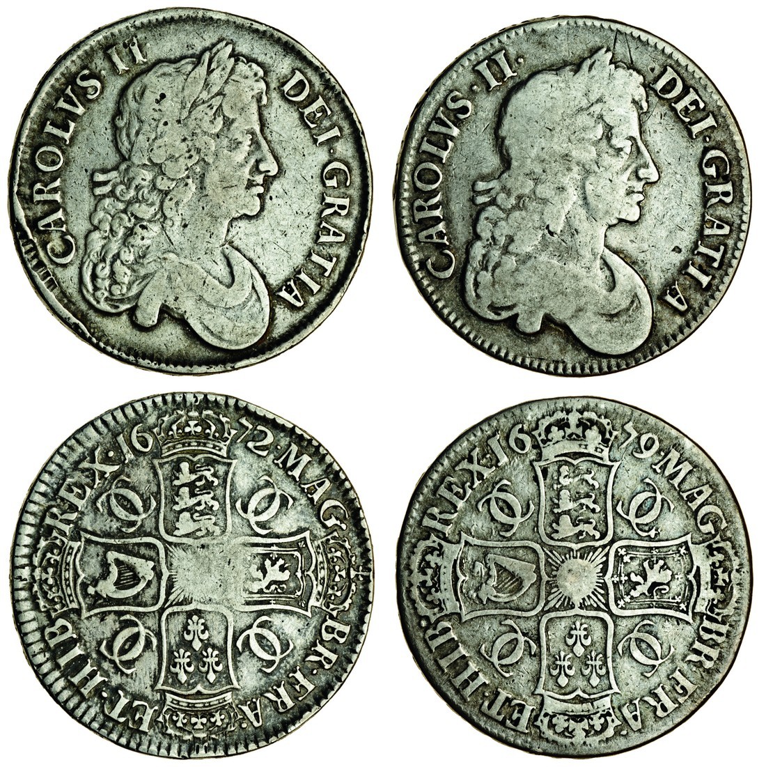 Charles II, (1660-85), Crowns (2), 1672 vicesimo qvarto, third bust right (ESC 45; S.3358), third bust right, 1679 tricesimo primo (ESC 56; S.3358), fair to fine (2)