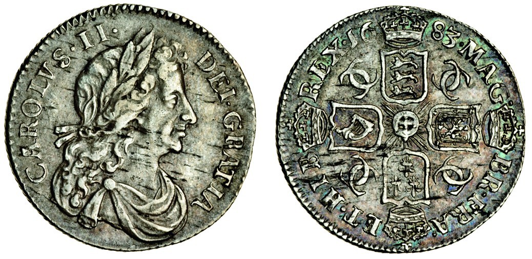Charles II (1660-85), Sixpence, 1683, laureate draped bust right, rev. four crowned shields cruciform, monogram in angles (ESC 1523; S.3382), toned, hay marks on both sides, marks to neck, good very fine