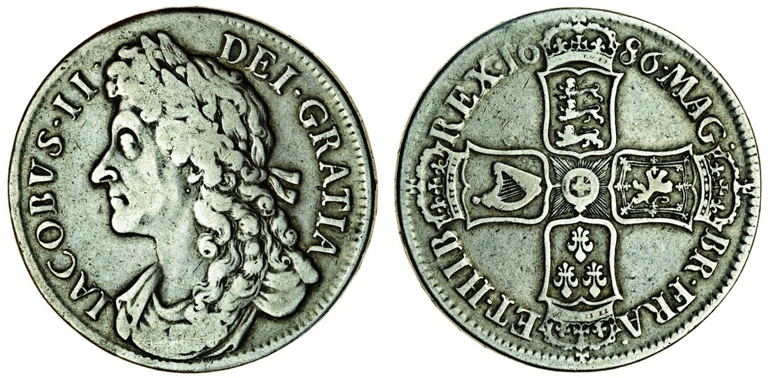 James II (1685-88), Crown, 1686 secvndo, first laureate draped bust left, rev. four crowned shields cruciform, (ESC 76; S.3406), fine