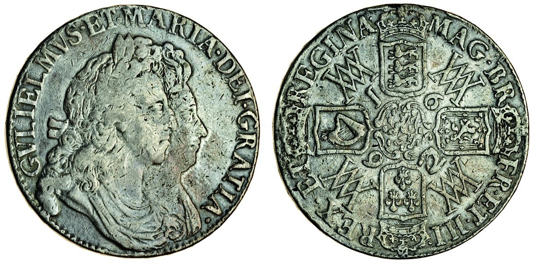William and Mary (1688-94), Crown, 1692/inverted 2 qvinto, laureate conjoined busts right, rev. four crowned shields cruciform, monogram in angle (ESC 85; S.3433), edge marks, scuffed, fine