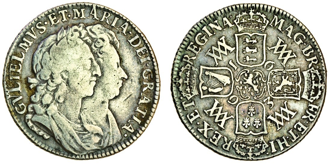 William and Mary (1688-94), Shilling, 1693, conjoined busts right, rev. four crowned shields cruciform, wm monogram in angles (ESC 1076; S.3437), cleaned, marks on obverse, fine