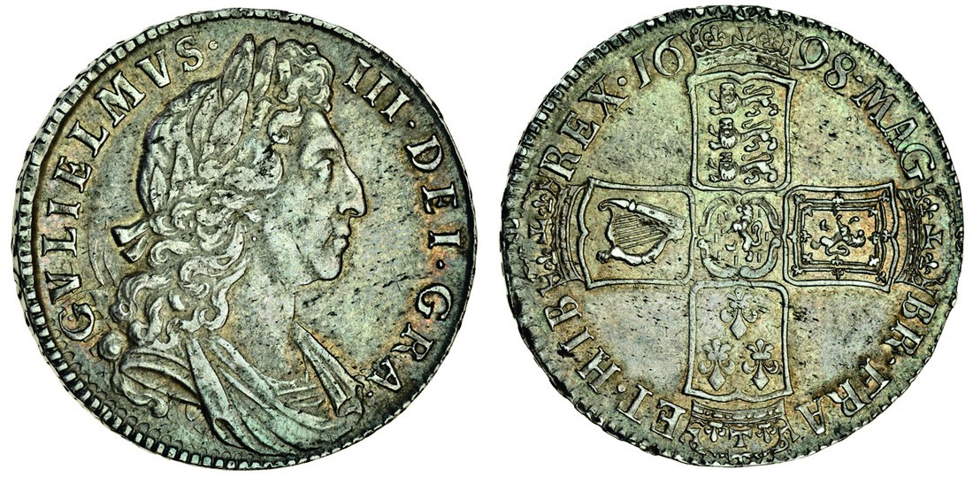 William III (1694-1702), Halfcrown, 1698 decimo, first laureate, draped bust right, rev. four crowned shields cruciform (ESC 554; S.3494), haymarking, ghosting behind bust, about extremely fine, toned