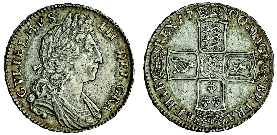 William III (1694-1702), Halfcrown, 1700 decimo tertio, first laureate draped bust right, rev. four crowned shields cruciform, edge inverted a for v in decvs (ESC 563; S 3494), lightly toned, some marks, edge knock at 4 o'clock on reverse, good very fine, rare