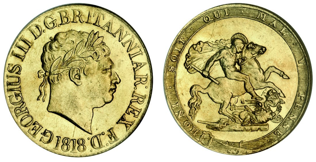 (g) George III (1760-1820), Sovereign, 1818, laureate head right, ascending colon, space between rex and f:d:, rev. St George and dragon (Marsh 2A; S.3785A), in NGC holder graded AU58, scarce