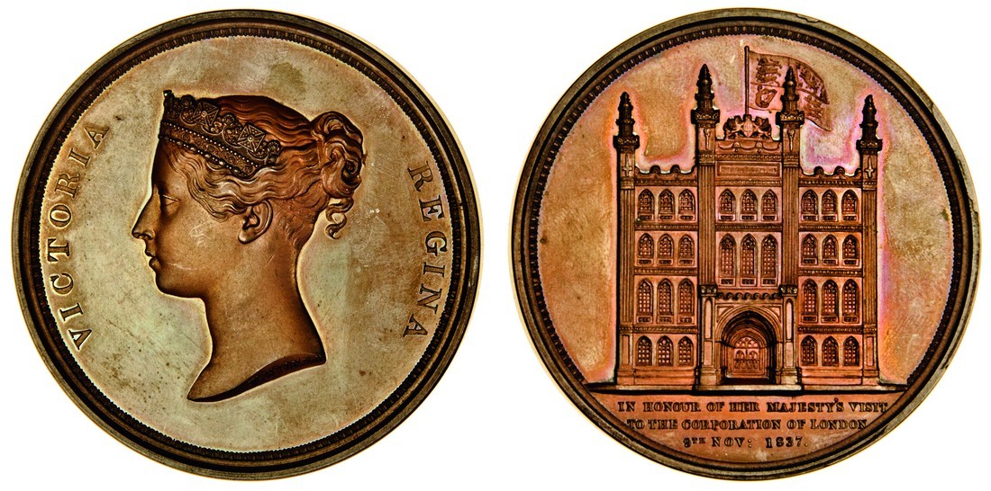 Victoria, Visit to the City of London, 1837, bronze medal by W. Wyon, head left, rev. view of the Guildhall, 54mm. (BHM 1775; E.1304), extremely fine, in case of issue