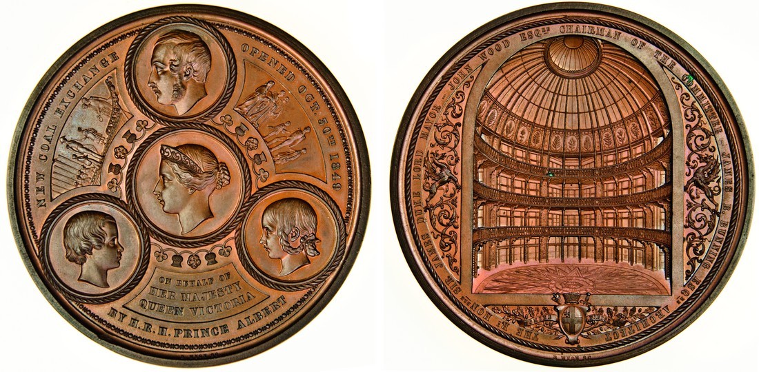 Victoria, Opening of the New Coal Exchange, 1849, bronze medal by B. Wyon, four heads in medallions, rev. Interior of the Exchange, 89mm. (BHM 2357; E.1435; W.6), extremely fine, scarce, only 350 struck, in case of issue