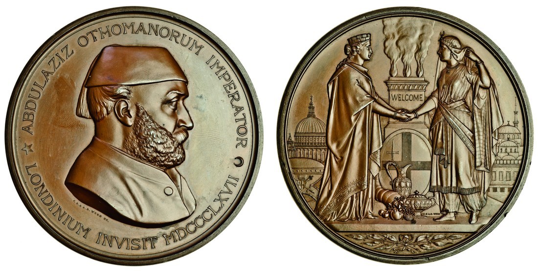 Victoria, Visit of Abdul Aziz, Sultan of Turkey, to London, 1867, bronze medal by J.S. and A.B. Wyon, bust right, rev. Londinia welcomes Turkey, 77mm. (BHM 2872; E.1591; W.10), one tiny mark on reverse edge at 4 o'clock, extremely fine, rare, only 350 struck, with scuffed case of issue