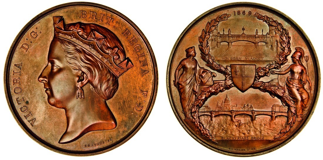 Victoria, Opening of Blackfriars Bridge and Holborn Viaduct, 1869, bronze medal by G.G. Adams, head left, rev. views of the bridge and viaduct, 77mm. (BHM 2906; E.1604; W.11), extremely fine, scarce, only 400 struck, in case of issue