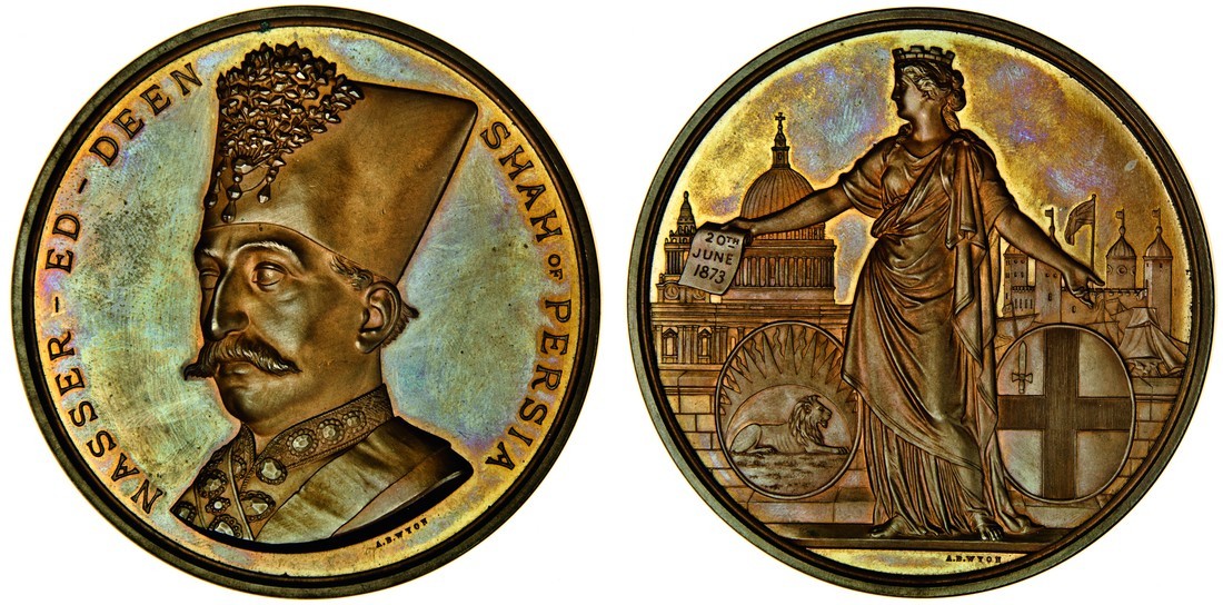 Victoria, Visit of the Shah of Persia 1873, bronze medal by A.B. Wyon, nasser-ed-din shah of persia, bust three-quarters left, rev. Londinia standing between shields of Persia and London, 77mm. (BHM 2951; E.1623; W.13), extremely fine, scarce, only 400 struck, in case of issue