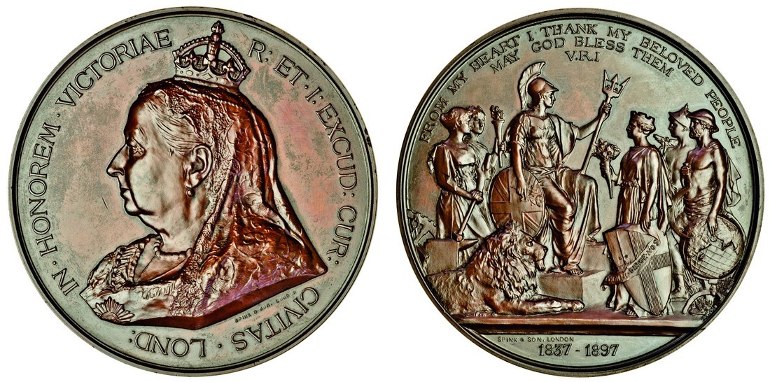 Victoria, Diamond Jubilee 1897, bronze medal by F. Bowcher, manufactured by Spink for the Corporation of the City of London, bust left, rev. Britannia recieving Londinia accompanied by Mercury, Agriculture, Industry and Knowledge, 76mm. (BHM 3510; E.1815), extremely fine, scarce, only 500 struck