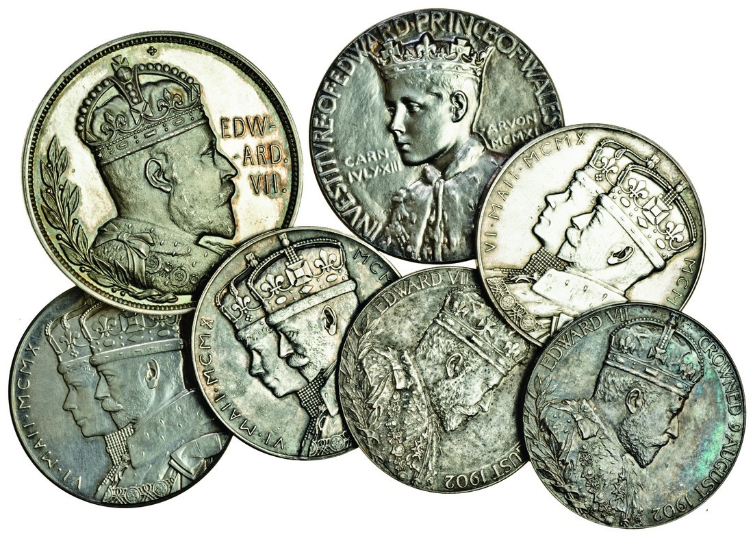 Edward VII, Coronation 1902, small silver official medals (2), by G.W. de Saulles (BHM.3737), on his death 1910, silver medal by Fattorini (BHM3983 not listed in silver), George V, Investiture of the Prince of Wales 1911, oficial silver medal by W.G. John (BHM 4079), Jubilee 1935, small official silver medals (3), by P. Metcalfe (BHM 4294), all extremely fine, only one example of the Fattorini medal is noted by Brown, this being a gold example in the Royal Collection (7)