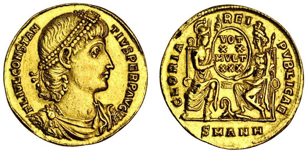 Constantius II (AD337-361), AV Solidus, 4.52g, Constantinople, 347-355, fl ivl constantivs perp avg, pearl-diademed, draped and cuirassed bust right, rev. gloria repvblicae, Roma and Constantinopolis seated, holding between them shield inscribed vot xx mvlt xxx, smanh in exergue (C.108; RIC 81), edge smoothed from a mount, good very fine