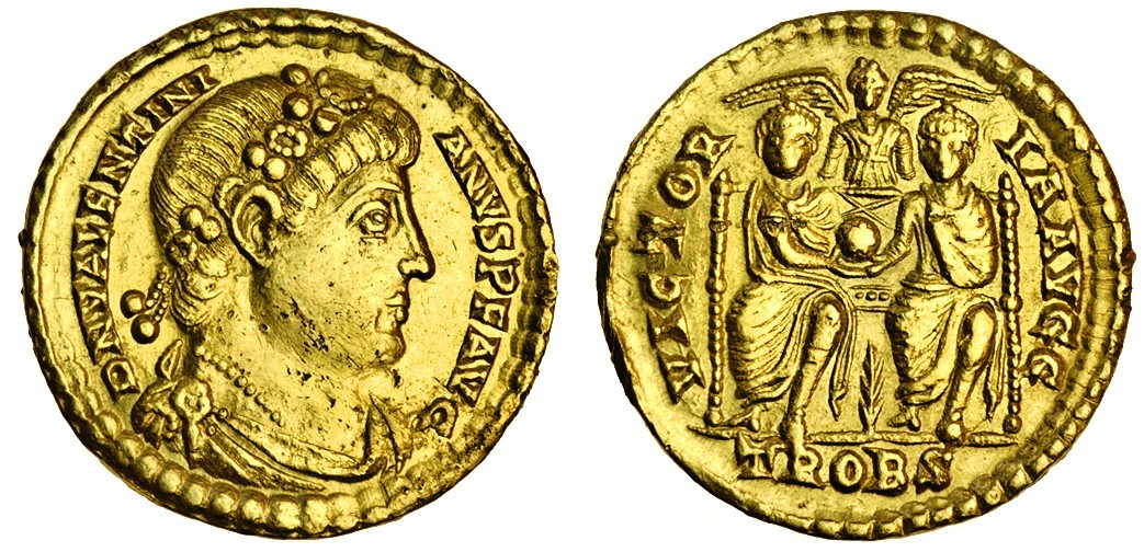 Valentinian I (AD 364-375), AV Solidus, 4.46g, Trier, 367-375, rosette-diademed, draped and cuirassed bust right, DN VALENTINI-ANVS PF AVG, rev. VICTORI-A AVGG, Valentinian and Valens enthroned facing, holding globe between them, Victory with spread wings above, palm-branch between their legs, TROBS in exergue (RIC 17b), good very fine