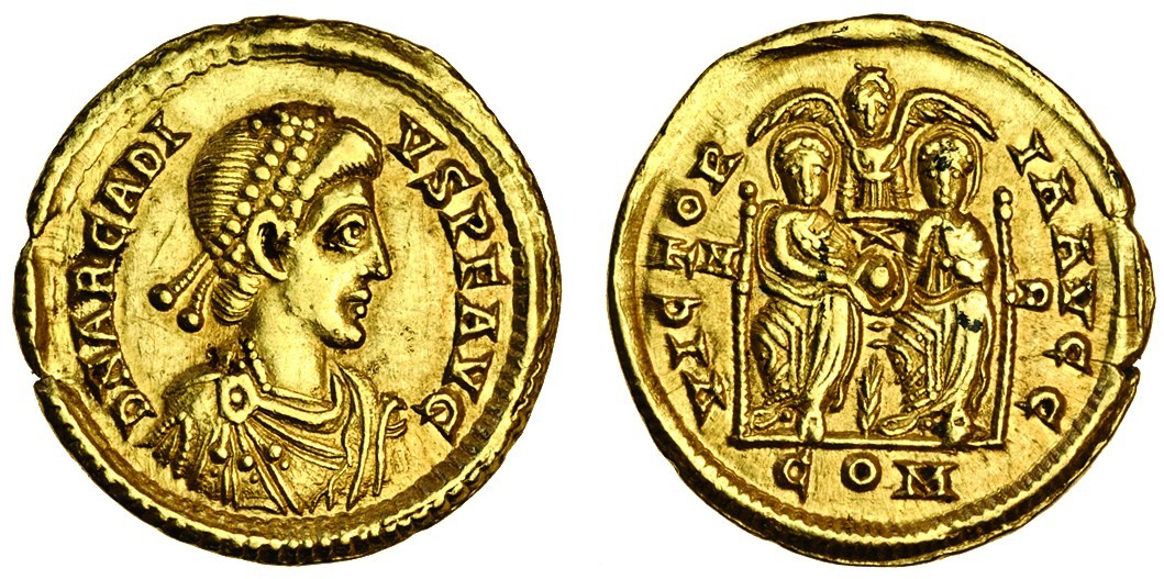 Arcadius (AD 383-408), AV Solidus, 4.45g, Mediolanum (Milan), pearl-diademed, draped and cuirassed bust right, DN ARCADI-VS PF AVG, rev. VICTORI-A AVGG, Arcadius and Honorius enthroned facing, holding globe between them, Victory with spread wings above, palm-branch between their legs, M-D in field, COM in exergue (RIC 8c and 20c), minor edge-marks, good very fine