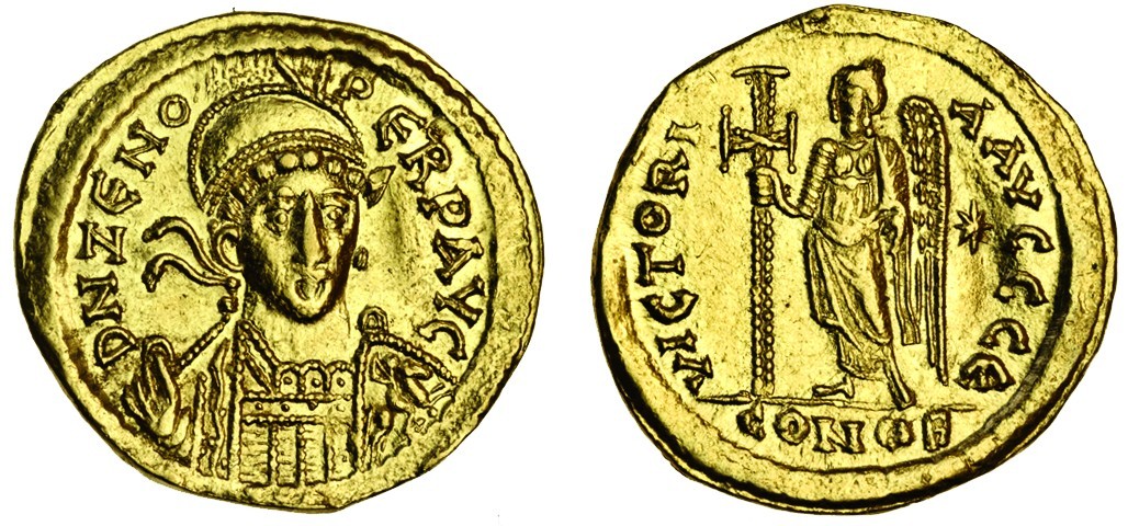 Zeno (second reign, AD 476-491), AV Solidus, 4.47g, Constantinople, three-quarters facing bust inclined right, wearing pearl-diademed plumed helmet and cuirass, holding spear and shield with horseman device, DN ZENO PERP AVG, rev. VICTORI-A AVGGE, Victory standing left, holding long jewelled cross, star on right, CONOB in exergue (RIC 910), flan very slightly bent on right, about extremely fine